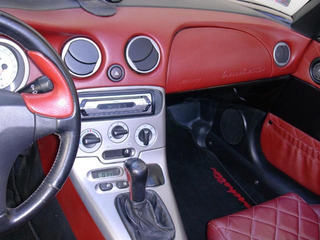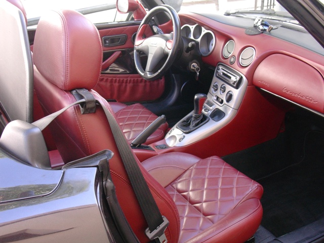 - standard Riviera tj. fotele, kierownica, gałka zmiany biegów, boczki drzwi obite bordową skórą dla kolorów Nero Seta, Giallo Ginestra + bordowy dach
