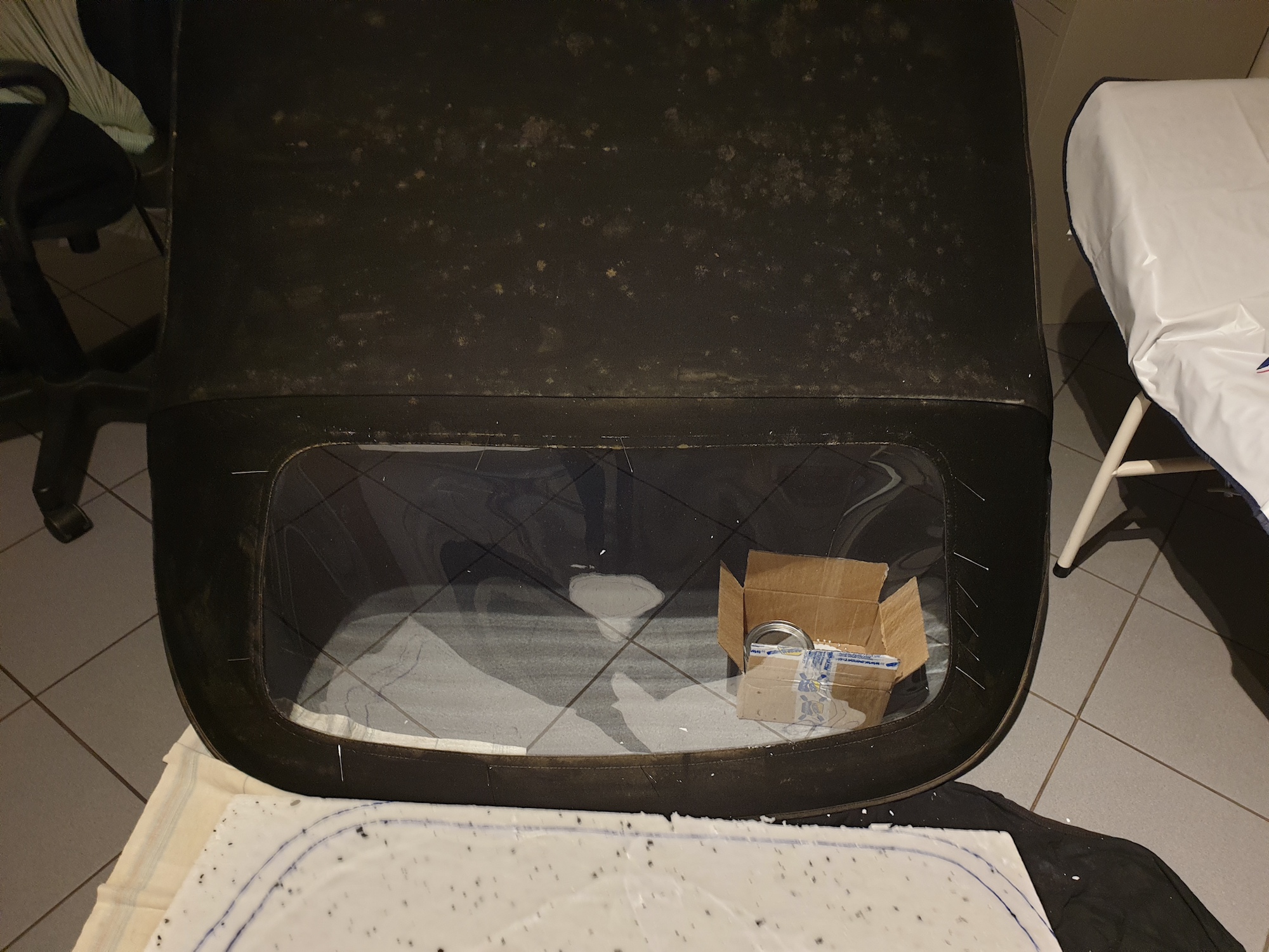 Udało się przykręcić fotel, jeszcze bez składania podłogi. Wsadziłem ręcznik papierowy tam gdzie ciekło i zrobiłem tak 10km.