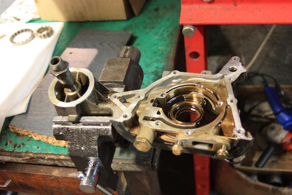 Kolejnym elementem poddanym poważniejszym zabiegom renowacyjnym była pompa oleju. Jej częścią jest zaworek regulujący ciśnienie oleju. To mały tłoczek zamontowany na sprężynie. Kiedy ciśnienie generowane przez pompę jest zbyt duże, tłoczek się przesuwa i otwiera kanał, którym część oleju wraca bezpośrednio do miski. Jeżeli ten tłoczek zatrze się w pozycji otwarte (sprężyna nie da rady go zamknąć kiedy spadnie ciśnienie oleju), w silniku może wystąpić poważny problem ze smarowaniem.