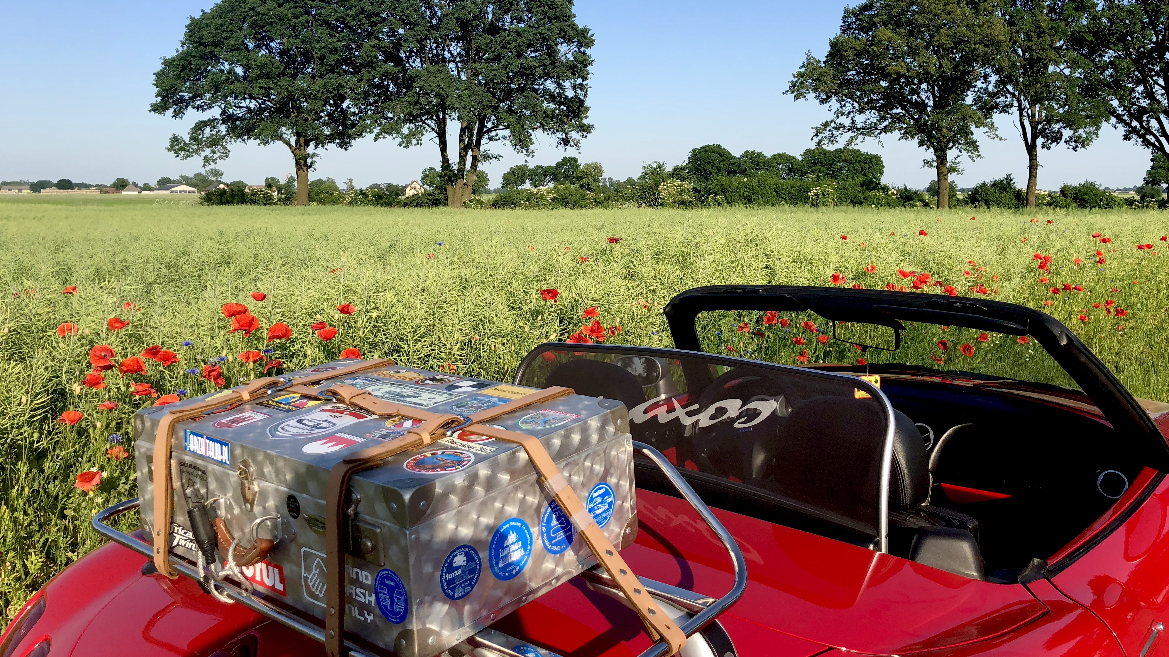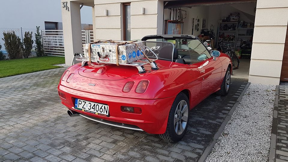 oryginalny bagaznik FIATa dedykowany do barchetty plus stylowa drewniano-skorzana walizka