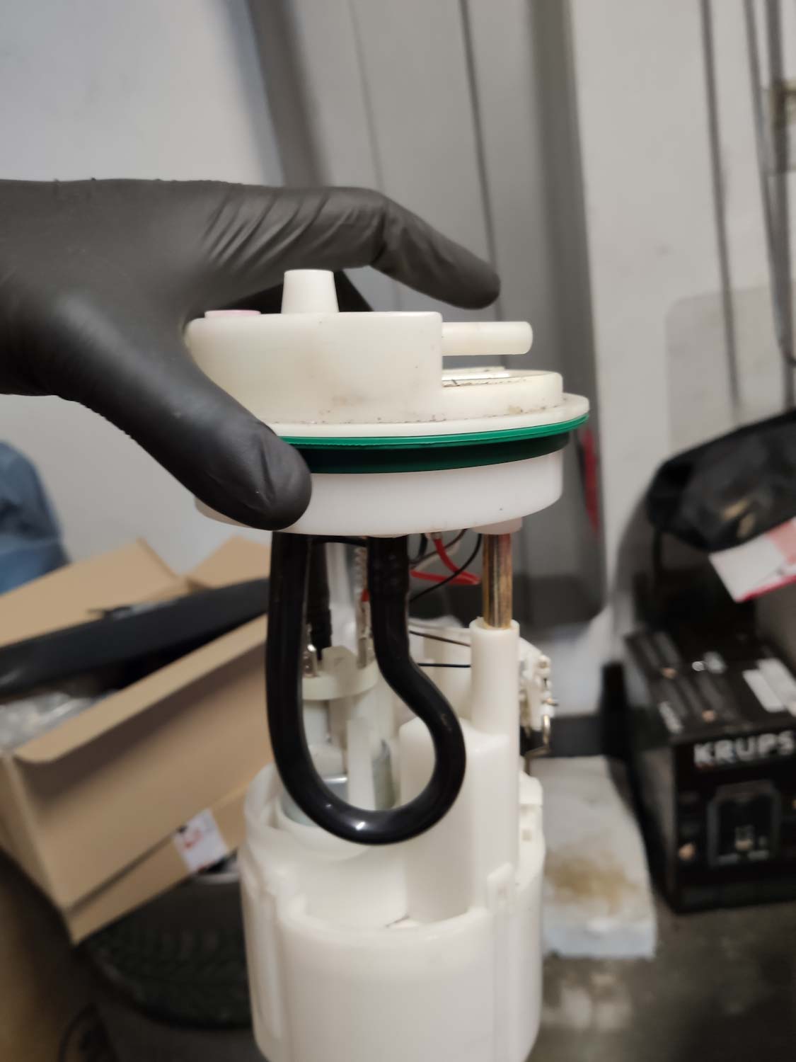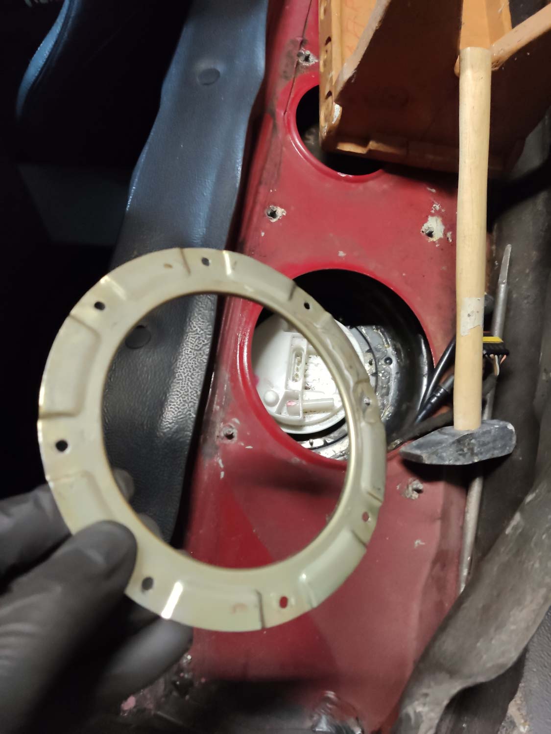 Po otwarciu wieka, pod którym jest zbiornik paliwa zobaczyłem dziwna rzecz. Całość była uklejona sylikonem. Podobno miało być do naprawy tylko to metalowe trzymanie modułu z pompą. Jak się okazało, prawdziwym winowajcą okazała się podwinięta uszczelka.
