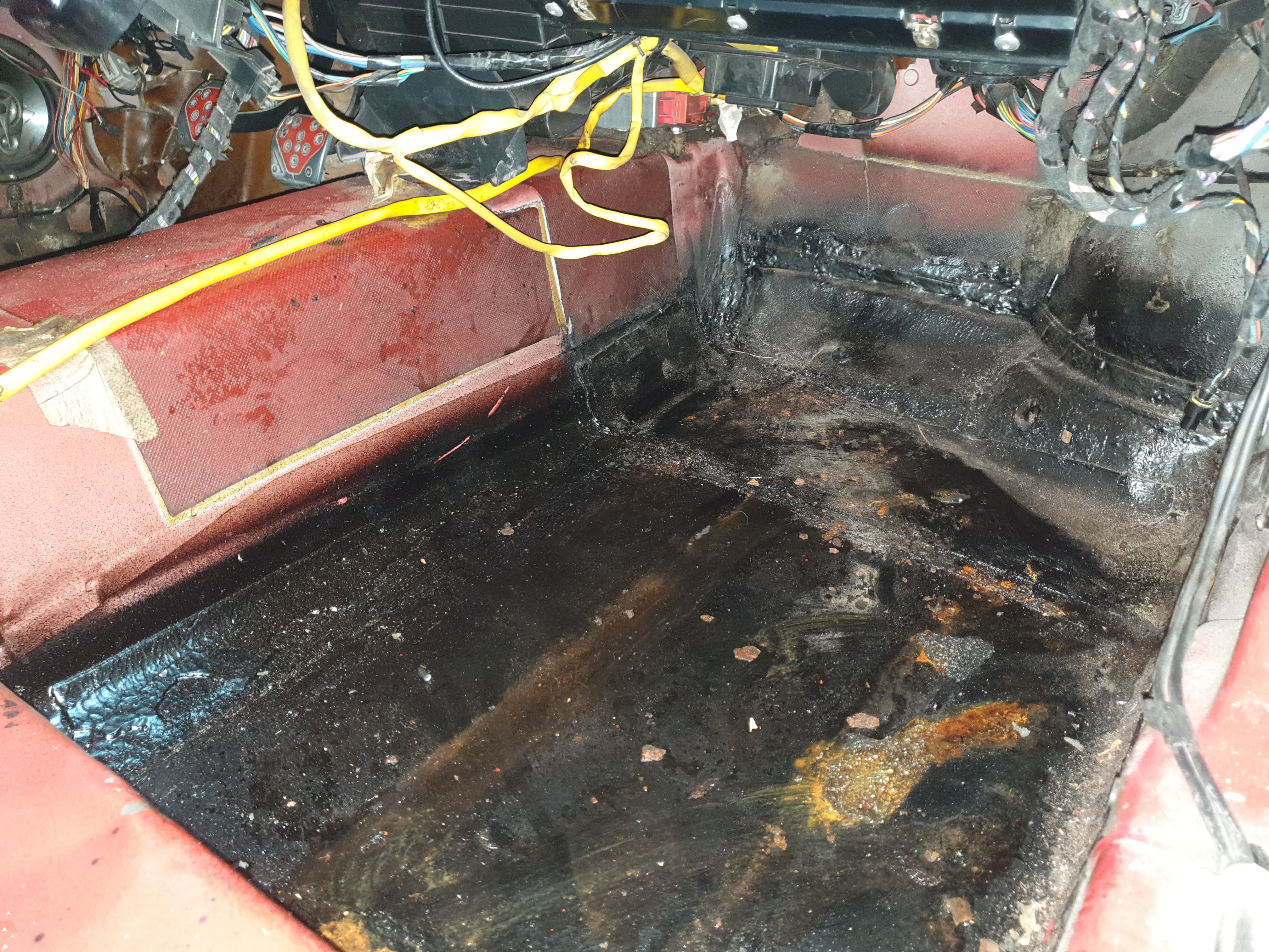 Okazało się, że niestety płyn musiał bardzo długo lecieć, gdyż jak ją położyłem na podłodze to lało się z niej okrutnie. Czekam teraz aż wyschnie, ile będzie trzeba tyle sobie w kotłowni poleży. Chcę teraz wsadzić fotel kierowcy, zalać układ chłodzenia, odpowietrzyć i przejechać trochę kilometrów, żeby sprawdzić czy nie cieknie gdzieś dalej płyn, zanim wykładzina wróci do samochodu.