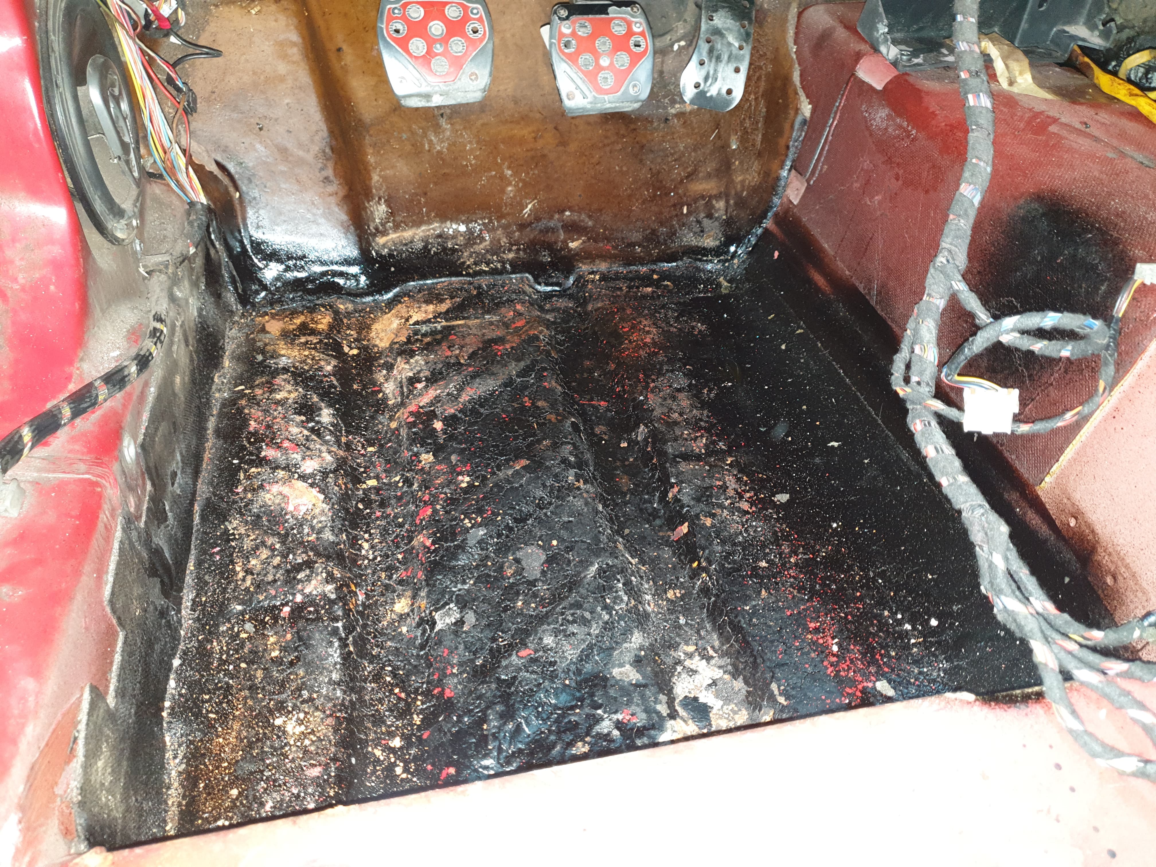 Kolejna niespodzianka, okazało się, że podłoga nie dość, że zrobiona porządnie to zabezpieczona bardzo przyzwoicie :) Jedyne miejsce do poprawy, to pan który mi podnosił samochód przy robieniu wydechu, wgiął mi pod nogami kierowcy kawałeczek podłogi i odpadło zabezpieczenie. Teraz trzeba całe to wyczyścić, zabezpieczyć barankiem i poskładać :)