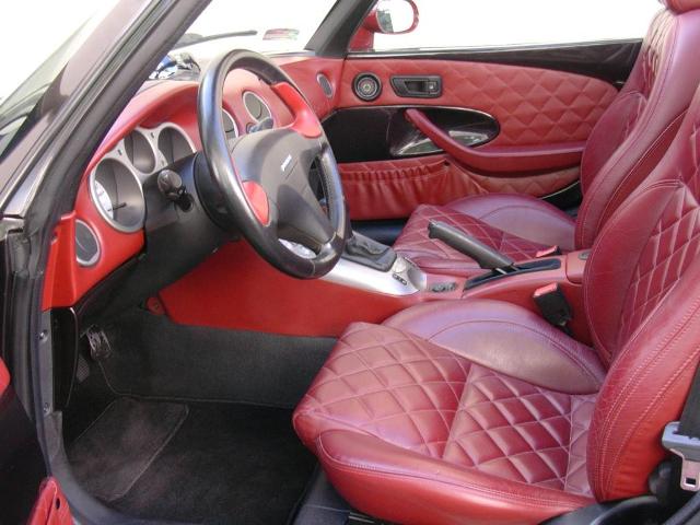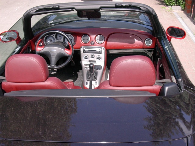 - standard Riviera tj. fotele, kierownica, gałka zmiany biegów, boczki drzwi obite bordową skórą dla kolorów Nero Seta, Giallo Ginestra + bordowy dach