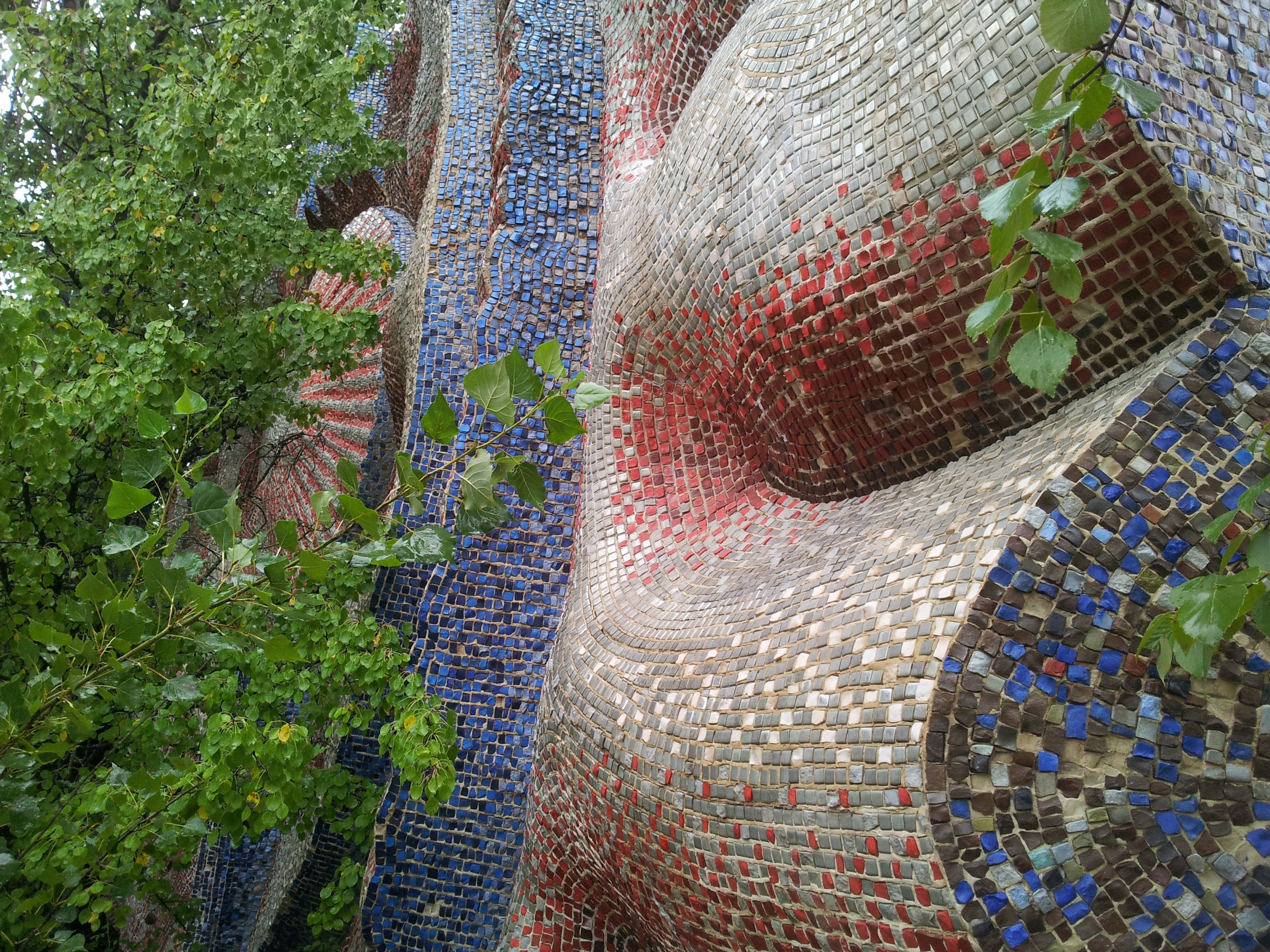 Pomnik przez budynkiem KC ledwo widoczny przez zasłaniające drzewa